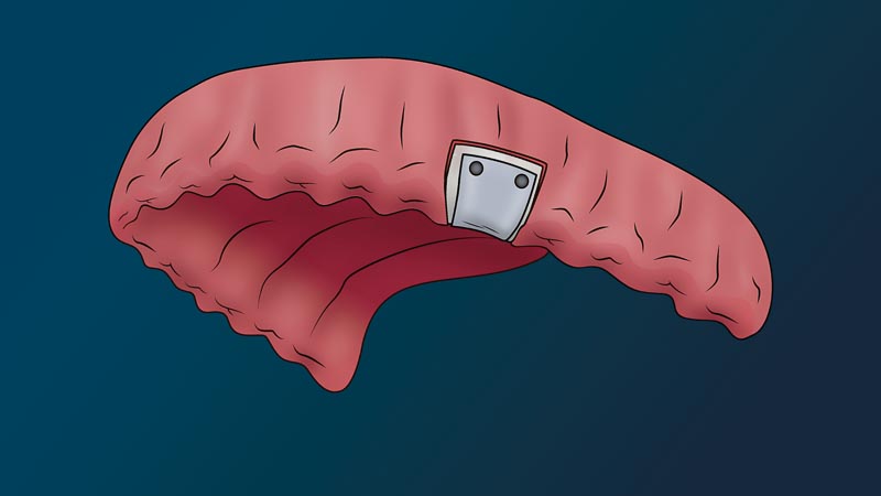 A full arch with no teeth. A piece of bone has entered a hole. A small, flat, paper-like piece looks as if it will be placed overtop of the hole.